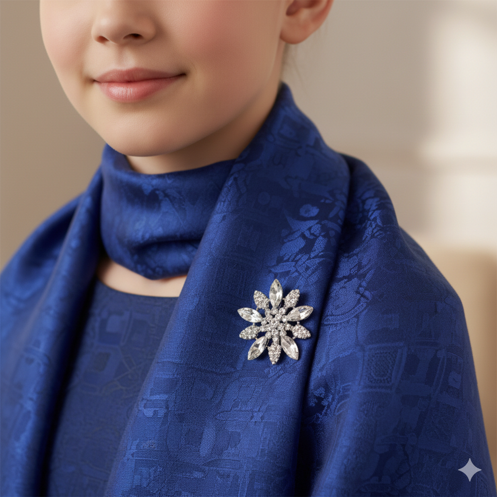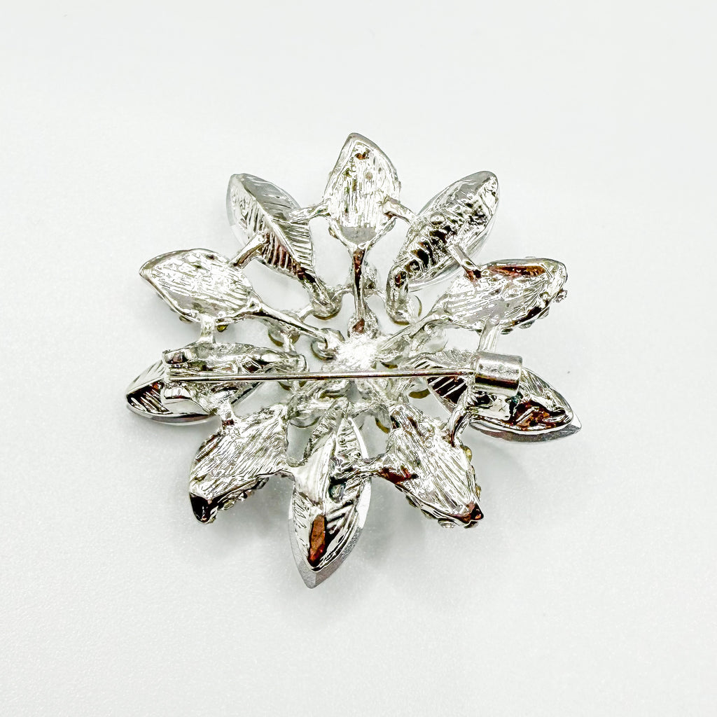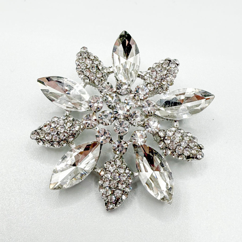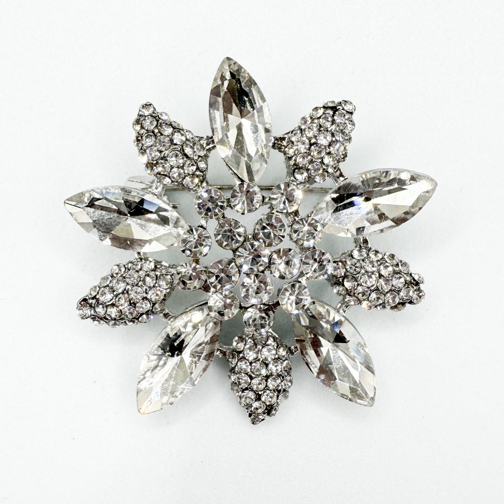 A dazzling floral inspired brooch designed to capture light from every angle. This piece features a stunning arrangement of marquise cut clear crystals, shaped like radiant petals blooming from a brilliant cluster of round rhinestones at the center. Each petal is framed with micro pavé stones, giving the brooch maximum sparkle and a luxurious high end finish.
