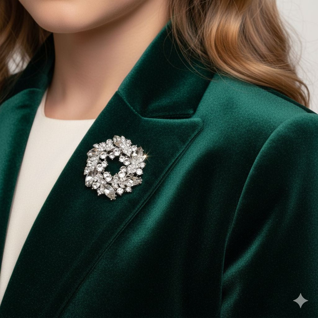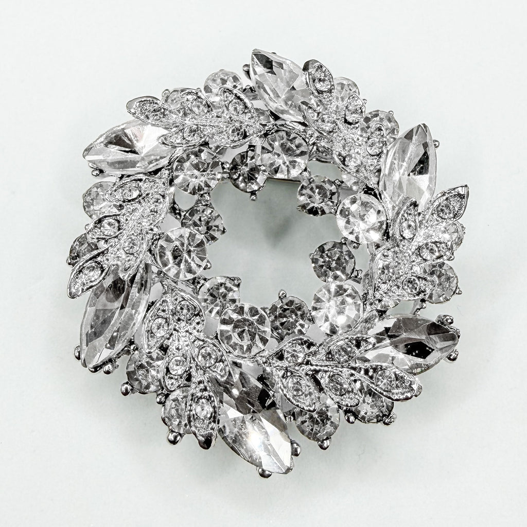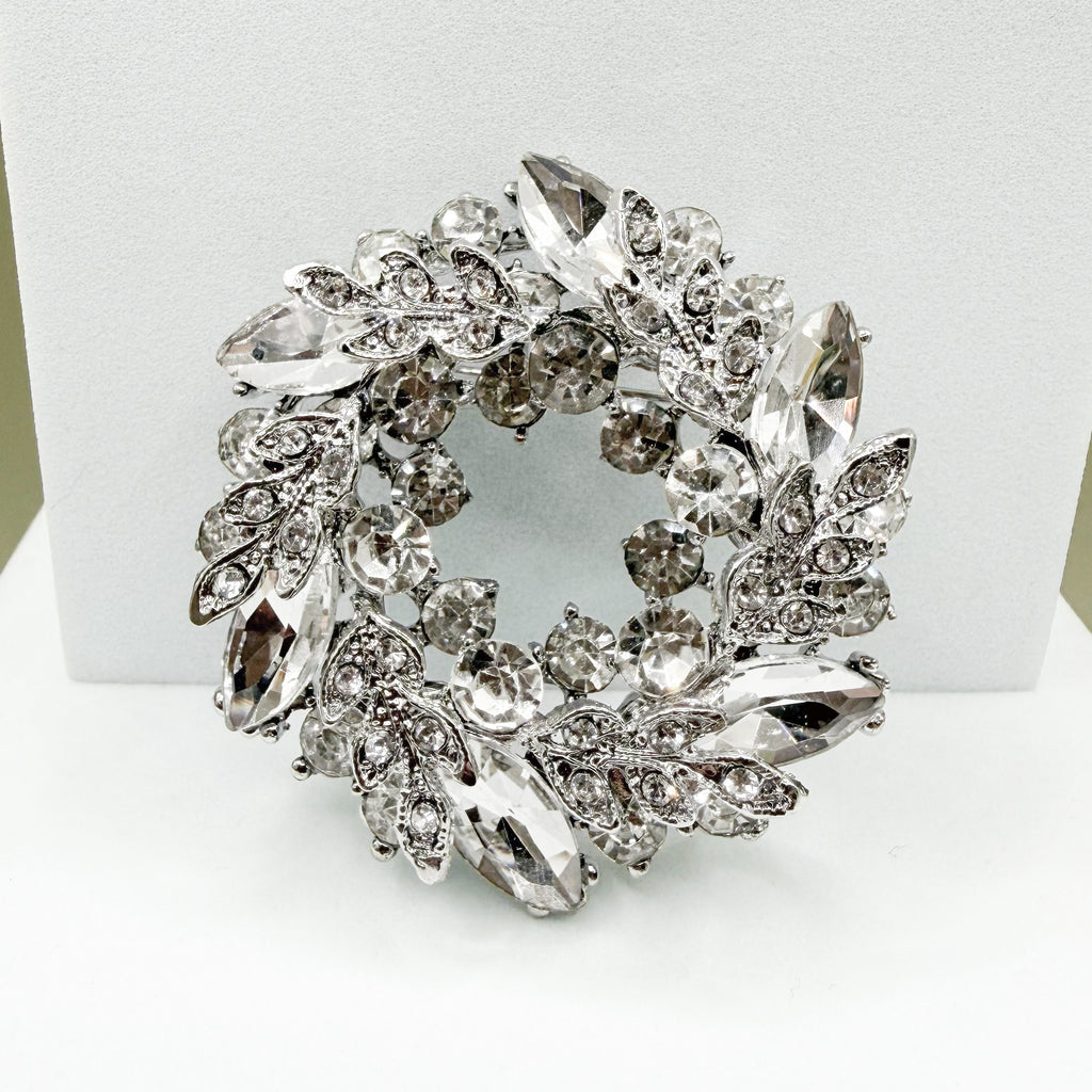 This stunning wreath brooch showcases a timeless wreath design, beautifully crafted in a silver-tone setting and adorned with an array of sparkling clear rhinestones. Brilliant round-cut stones are interspersed with elegant marquise-cut crystals, forming delicate leaf-like clusters that create depth, texture, and captivating shine.