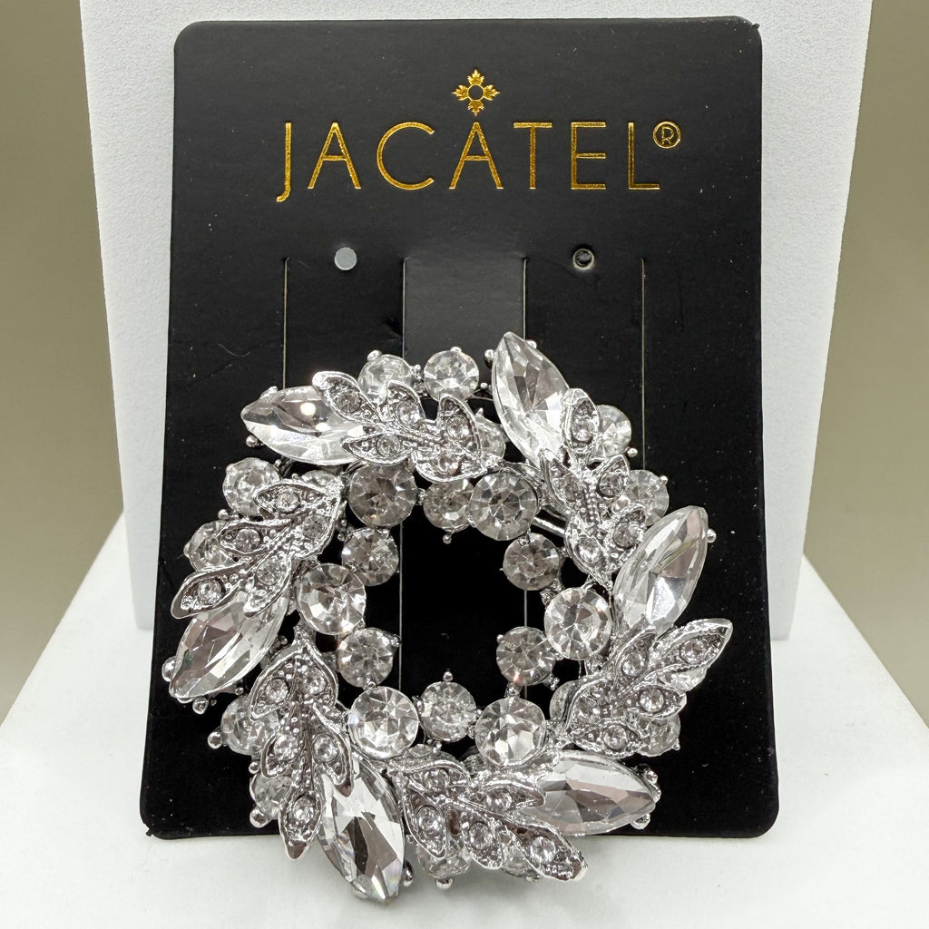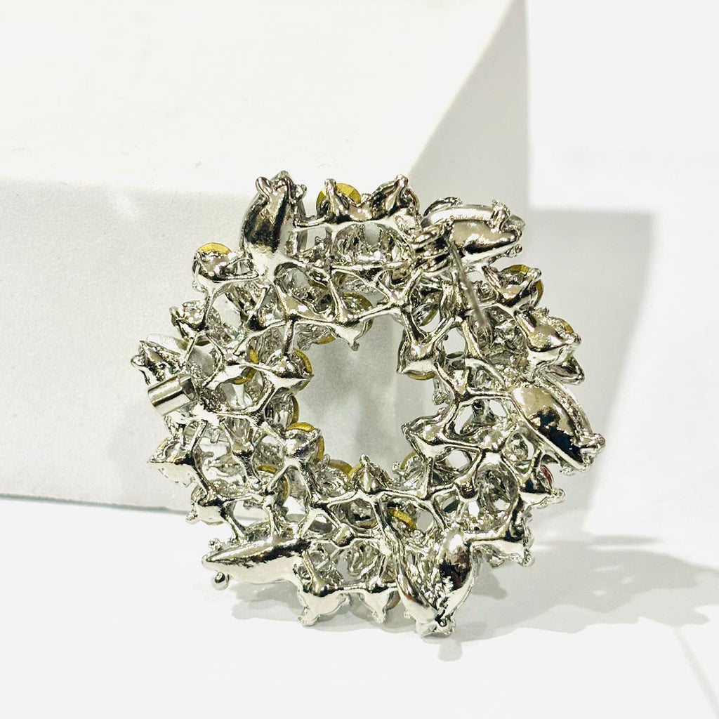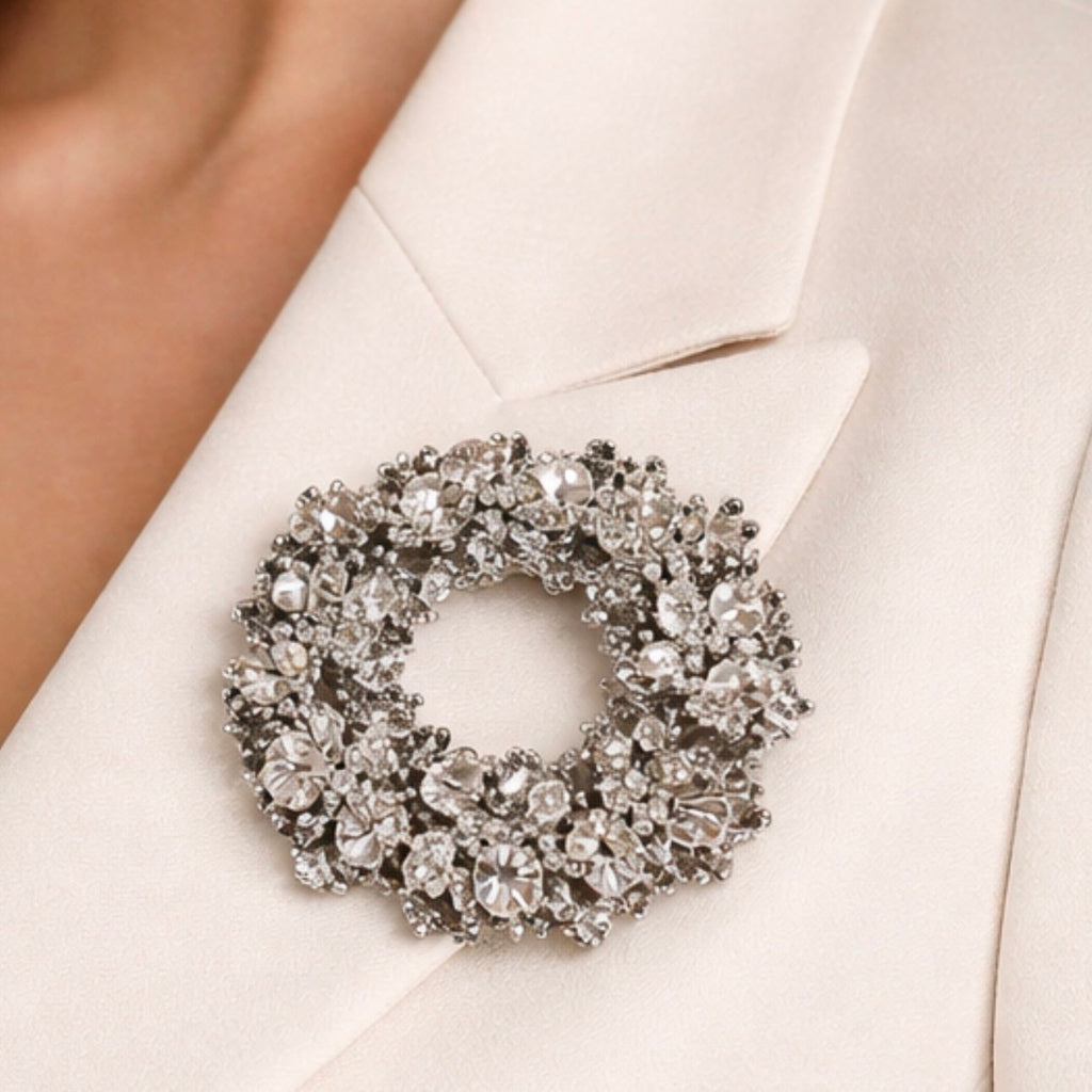 This stunning wreath brooch showcases a timeless wreath design, beautifully crafted in a silver-tone setting and adorned with an array of sparkling clear rhinestones. Brilliant round-cut stones are interspersed with elegant marquise-cut crystals, forming delicate leaf-like clusters that create depth, texture, and captivating shine.
