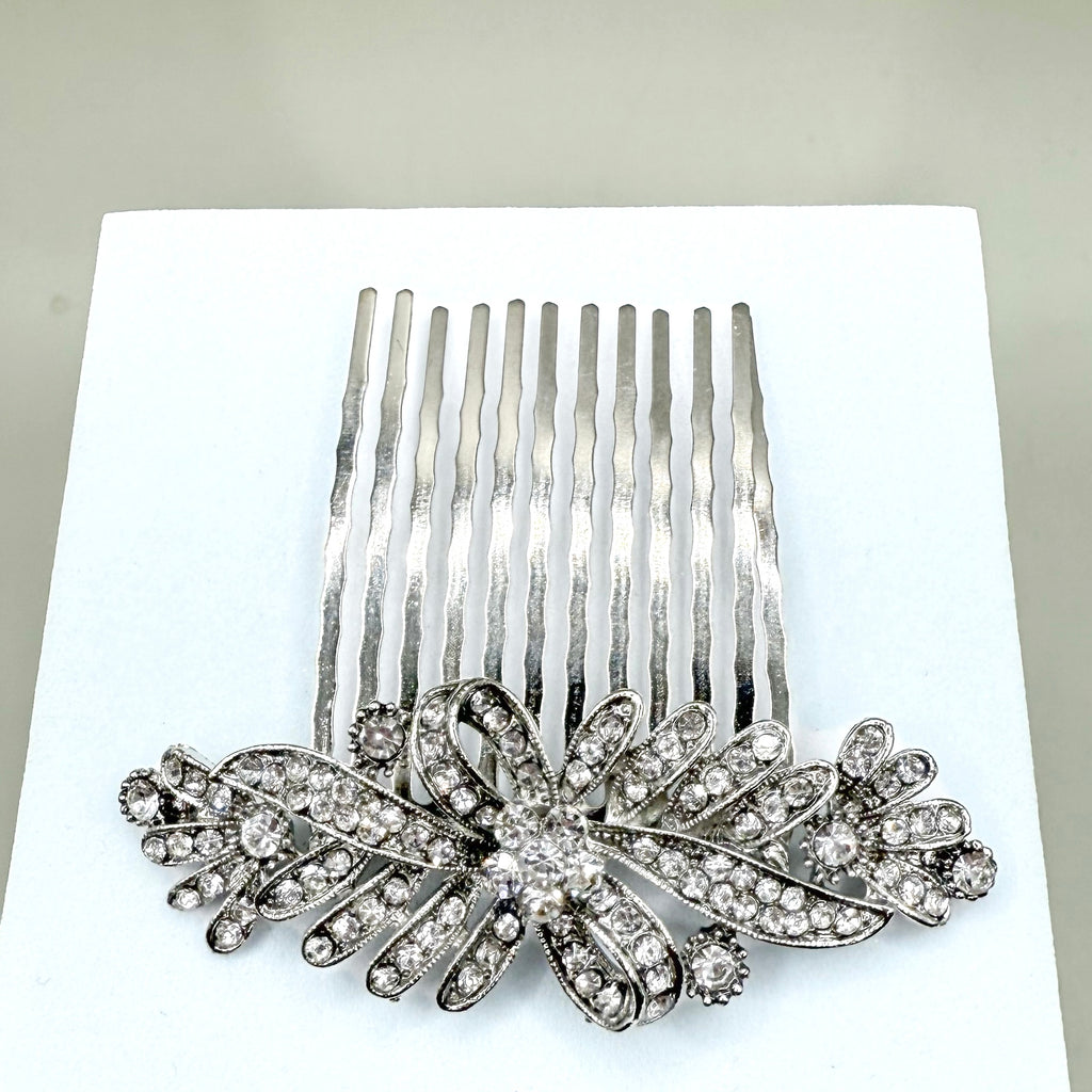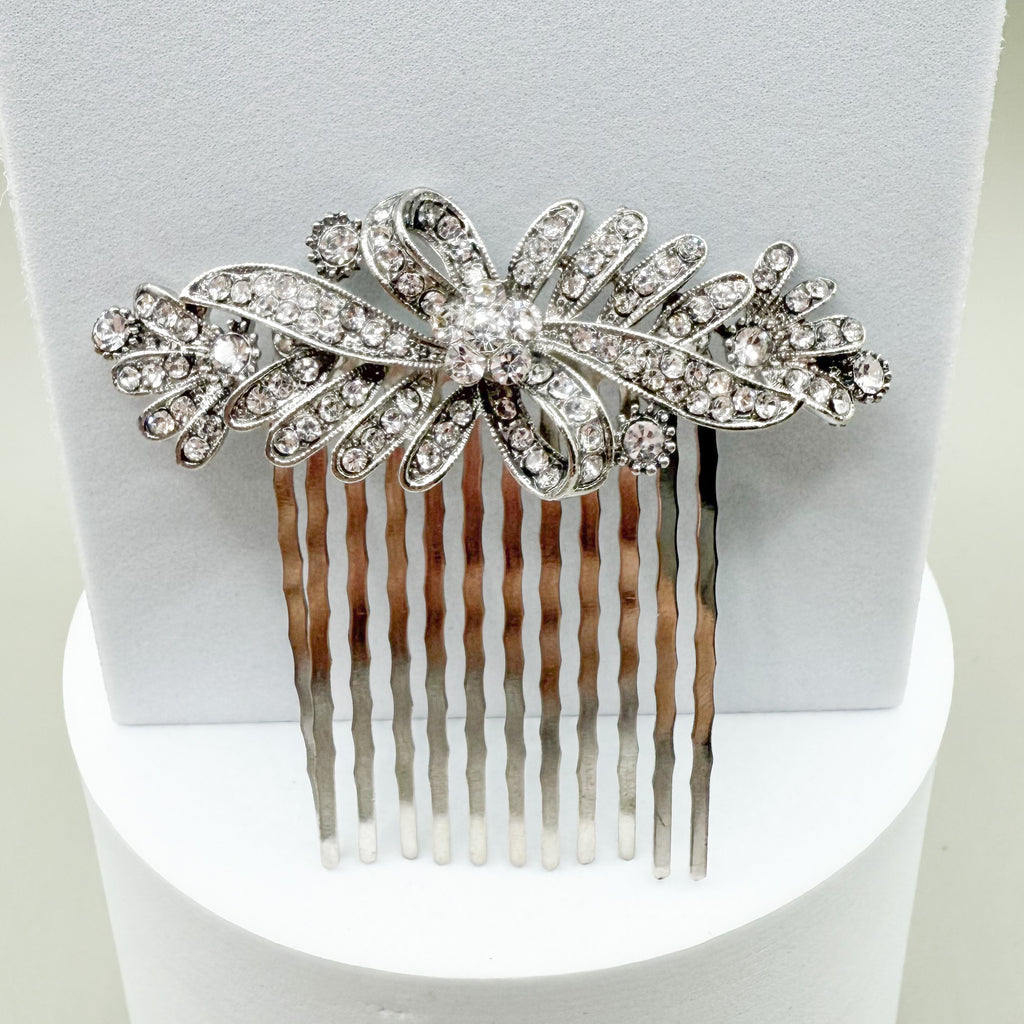 Add a touch of timeless elegance to your hairstyle with this crystal embellished bow hair comb. The design features a graceful ribbon like bow at the center, surrounded by delicate leaf accents. The bow shape gives it a soft, feminine look, while the surrounding crystal details add extra brilliance from every angle.